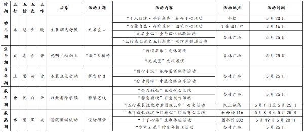 活动将五行学说与心理发展阶段理论相结合,围绕“五情、五脏、五色、五味、五音”设计互动环节。根据五行相生和五行应象开展“木—元启童心、火—‘欣’火相传、土—择吉甘旨、金—雅馨艺栈、水—流绪微梦”五个系列活动,包含“五行应象”明信片传递、“自得其乐”趣味游戏、“炎武堂”太极展演、“金石雅韵”五音悦心、“馨囊香授”香囊制作、“五行成长之手绘我心”“五行成长之爱意萦绕云中”“分甘同味”中医膳食养生等十余个分活动。