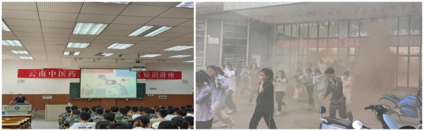 驻校消防技工、义务消防员和部分师生员工参与的消防地震应急疏散演练活动:消防常识讲座、师生参与模拟火灾现场逃生演练。