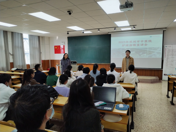 云中讯(通讯员 李泽飞)3月15日上午,深圳市中医院护理部主任徐明明一行到护理学院开展2023年度护理人才专场招聘会。护理学院党委书记毕立雄代表学院向深圳市中医院一行表示欢迎和感谢,并向到场毕业生做招聘会前动员,党委副书记黄冬梅介绍了学院2023届毕业生基本情况。护理学院2023届逾百名同学参加本次专场招聘会。