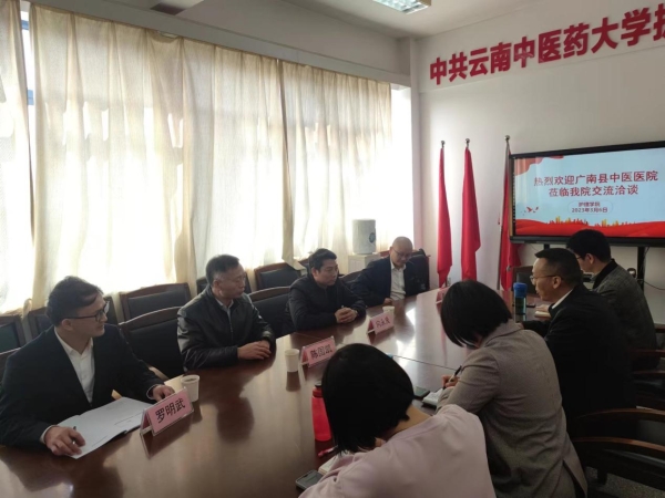 会上,毕立雄代表学院向广南县中医医院院长一行的到来表示热烈的欢迎。双方分别介绍了各自的基本情况,就毕业生就业、科学研究、社会服务等方面进行了深入讨论和交流,并在此方面达成了初步的合作意向,下一步将推动落实。