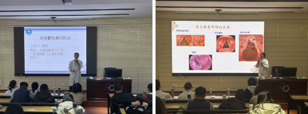 在学校报告厅,推拿科的向勇医师围绕肩颈腰腿痛的防治进行了专题宣讲,针对教师们长坐久站的问题,结合中医养生理论提出建议,倡导教师们加强体育锻炼,改变工作和生活习惯,避免长时间低头和长时间使用手机,出现不适症状时要及时就诊,不要耽误治疗时机;耳鼻喉科的李莉珠医师则结合临床病例,向大家科普了常用的护嗓方法,以及慢性咽炎等常见病的防治。医师们诙谐风趣的语言,生动贴合的案例以及“接地气”的讲述,受到教职工们的热烈欢迎,使他们对如何改善自己的身体健康状态有了清晰的认识。
