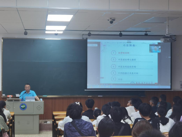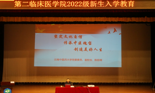 2022年11月6日,副校长陈祖琨从时代背景和社会需求方面,为第二临床医学院的2022级新同学带来开学第一课《坚定文化自信 传承中医瑰宝 创造美好人生》。陈祖琨结合党的二十大精神,提出了坚定文化自信,促进中医药传承创新发展,不忘医者初心、勇担时代责任的要求,希望新同学树立正确就业观,做好职业生涯规划。