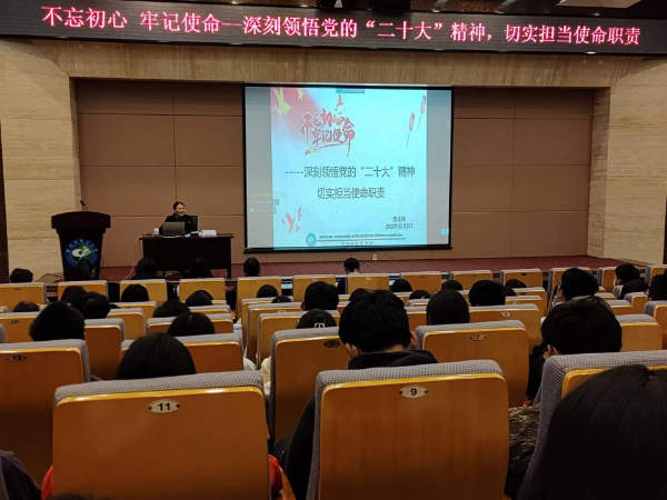 12月2日晚,副校长邰先桃教授以《不忘初心 牢记使命——深刻领悟党的二十大精神,切实担当使命职责》为题,采取线上线下相结合的方式为2022级新生讲授思政课。邰先桃教授从深刻领悟党的二十大精神出发,以“我是谁?如何担当使命职责?”为着眼点,重点交流了如何认识自己的多重角色与角色的科学合理转换,给同学们指明了成长成才之路。