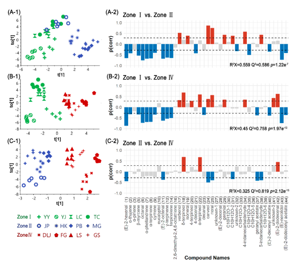 (A)区系Ⅰ vs. Ⅱ;(B)区系Ⅰ vs. Ⅳ;(C)区系Ⅱ vs.Ⅳ。(A1,B1,C1)OPLS-DA分析结果,(A2,B2,C2)成份差异的显著性水平(红色:显著增高;蓝色:显著降低;灰色:没有显著差异)