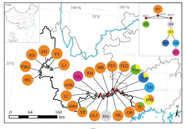 依据《云南植被》(吴征镒 & 朱彦丞)对云南植物区系的划分,云南的草果栽培在滇南、滇西南小区(小区Ⅰ)、滇东南小区(小区Ⅱ)和滇西、滇西北横断山脉小区(小区Ⅳ)这3个小区中。之前,我们对这3个小区的20个草果居群和5个拟草果居群进行了基于cpDNA单倍型和SSR分子标记的遗传多样性和居群遗传结构的研究。