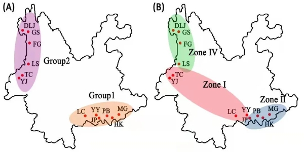 (A)组1和组2;(B)区系Ⅰ、区系Ⅱ和区系Ⅳ