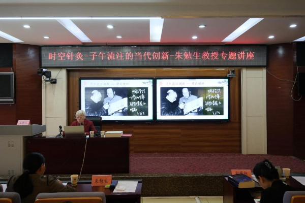 捐赠仪式结束后,朱勉生教授为云中学子讲授了“时空针灸—子午流注的当代创新”专题学术报告。时空针灸疗法是朱教授在继承古代四种按时取穴方法和吸纳欧洲医学文化理念的基础上,创新性地将时间穴位的记忆功能和空间穴位的同构功能相结合而提出来的。本次学术报告,朱教授详细介绍了子午流注的历史渊源、理论精粹和临床应用,并结合自己的经历和思考,就复兴古法的意义和时代的需要进行了精彩阐述。同时,朱教授表达了中青年守正创新的殷切希望。