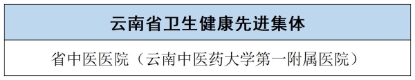 根据省委、省政府的表彰决定,我校第一附属医院(云南省中医医院)被授予“云南省卫生健康先进集体”称号,第一、第二附属医院王志祥等6人被授予“云南健康卫士”称号。