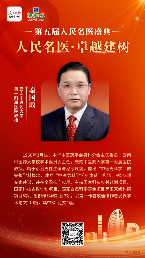 秦国政,1960年3月生,中华中医药学会男科分会主任委员,云南中医药大学学术委员会主任,云南中医药大学第一附属医院教授。精于诊治男性生殖与泌尿疾病,提出“中医男科学”的完整学科概念和建立“中医男科学学科体系”构想,制定发表3项专家共识并在全国推广应用。主持国家科技攻关计划项目、国家科技支撑计划项目、国家自然科学基金项目等国家级科研项目5项、省部级科研项目3项,以第一作者或通讯作者发表学术论文119篇,其中SCI论文4篇。