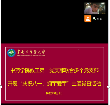 云中讯(通讯员 张磊)2022年8月1日是中国人民解放军建军95周年,为庆祝“八一”建军节,弘扬拥军爱军的光荣传统,中药学院教工第一党支部联合学生第八党支部、研究生第四党支部和广州陈李济药业党支部,线上和广州现场同步开展“喜迎八一,拥军爱军”主题党日活动。