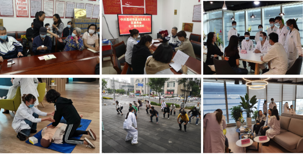 6月29日、6月30日,附一院蒲公英社科普及志愿服务队分别来到尚义社区、滨江社区开展志愿服务活动,慰问社区党员同志,赠送云南省中医医院院内制剂“紫连膏”,进行健康科普知识宣讲,为社区居民提供了推拿按摩服务,切实帮助提升居民健康理念。在恒隆广场的办公区,志愿者为社区工作人员及群众提供义诊、推拿、耳穴贴压、健康咨询等服务,还带领在场群众练习八段锦功法,帮助他们建立健康的观念,对疾病做到早预防、早诊断、早治疗。此外,志愿者现场还进行了心肺复苏等急救演示和辅导,提高辖区群众应急能力,用实际行动,践行社会主义核心价值观。