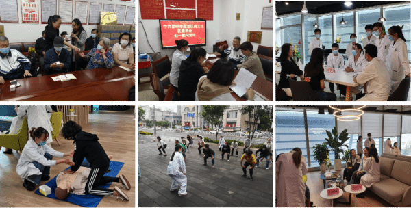 在尚义社区,第五党总支党员代表慰问了社区党员同志,赠送了云南省中医医院院内制剂“紫连膏”,宣讲健康知识,并为社区居民提供了推拿按摩服务,切实帮助提升居民健康理念,紧密联系群众,让党的温暖深入人心。在恒隆广场的办公区,来自妇科、眼科、内科、推拿科、儿科的党员志愿者为社区工作人员及群众提供义诊、推拿、耳穴贴压、健康咨询等服务,还带领在场群众练习八段锦功法,帮助他们建立健康的观念,对疾病做到早预防、早诊断、早治疗。此外,党员志愿者现场进行了心肺复苏等急救演示和辅导,提高辖区群众应急能力。用实际行动,践行社会主义核心价值观。