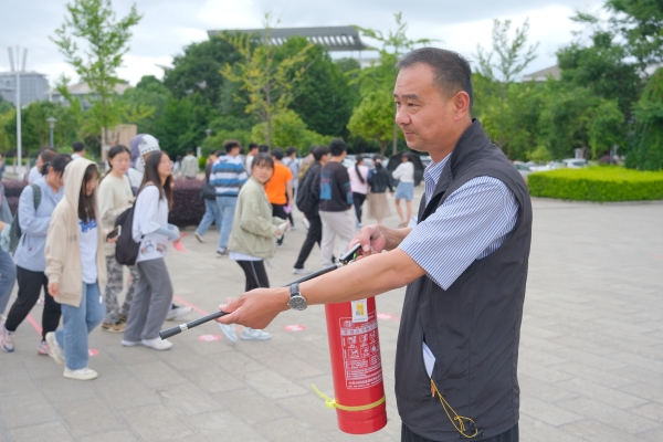 演练结束后,保卫处副处长周胜华要求演练的同学提高安全意识,提高应急灾害防范水平。同时还讲解演示了灭火器使用方法,学生代表进行现场体验及疑问解答。