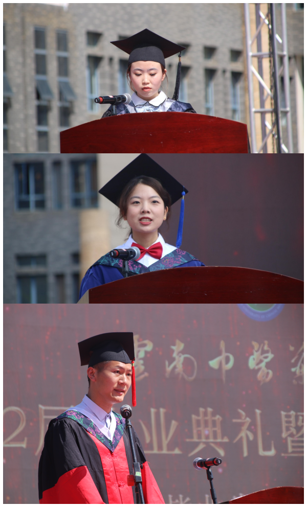 中药学院2018级兰茂班曾天艳同学作为本科毕业生代表发言:“也许我们现在还无法用‘今天我以母校为荣,明天母校将以我为荣’这样的豪言壮语来做出表白,但是我们能做到的是,今后在所从事的岗位上认真工作,让周围的人知道有一个毕业于云南中医药大学的同学,他很努力、很优秀,他的样子就是云中莘莘学子的样子。”