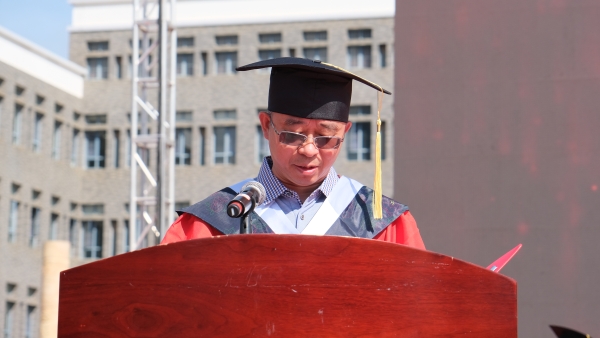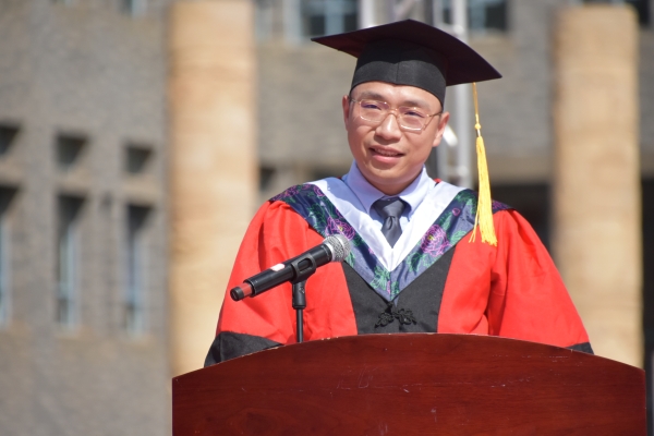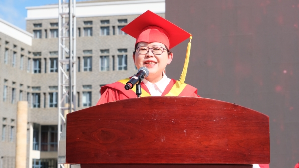 基础医学院王维老师作为教师代表发言:“……作为老师,我和你们一起度过了教学相长的难忘时刻,也和你们一起见证了学校‘申博’、‘更大’、甲子校庆等光辉历程。看着你们熟悉的脸庞从稚嫩中渐渐长出坚毅,我感到无比欣慰.在你们即将离校开启人生新旅程之际,我也衷心地为你们送上祝福:心系红土志岐黄,白衣为甲戊健康。苁蓉执鞭踏新程,远志何顾征途长。”