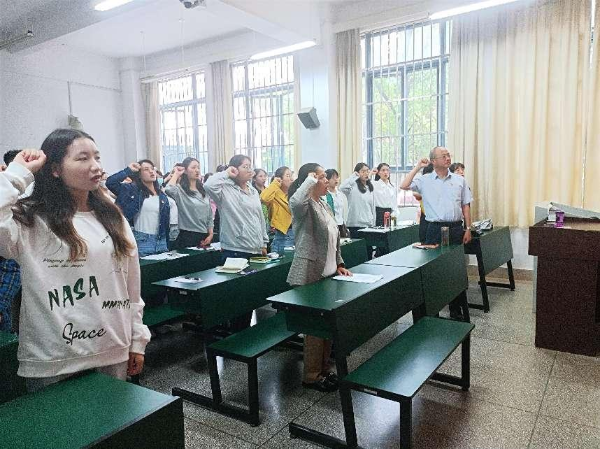 党课结束后,杨剑南领誓,全体毕业生党员重温入党誓词。毕业生党员面向党旗庄严宣誓,回顾铮铮誓言,坚定理想信念,不忘入党初心,牢记时代使命。