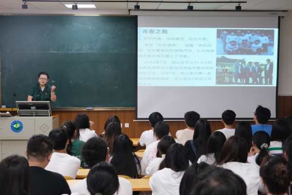 熊磊紧扣时代脉搏,贴近生活实际,结合自身38年从医生涯,渗透中医药文化,强化科学素养和人文精神,加深学生对中医药文化认知,提升学生的中医药文化自信。她指出,中医药学是中华民族的伟大创造,是中国古代科学的瑰宝;传承正是中医药的命脉所在,中医医史文献、中医基础理论、中医药文化等都是中医药应该传承的精华内容。