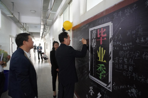 王翠岗在2017级针灸推拿学1班的签名墙上写下“青春是用来奋斗的”寄语,激励青年学子砥砺奋斗,踏浪前行。在班级答辩现场,他与同学们亲切交流,通过提问和点评的方式对同学们提出殷切期望:志存高远,脚踏实地,在树立远大理想的同时,脚踏实地、稳扎稳打,成就梦想;不断坚定志气,增强骨气,充实底气,勇担实现中华民族伟大复兴的重任;积极尝试,敢于推销自我,先就业后择业。