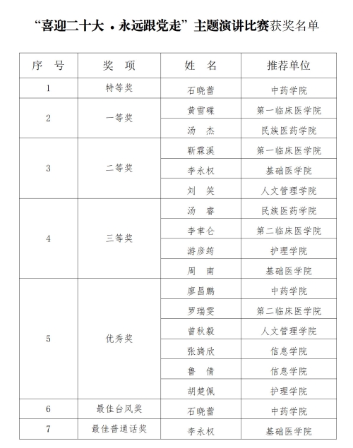 云中讯(校团委)为深入学习贯彻习近平总书记在庆祝建团100周年大会上的重要讲话精神,结合“喜迎二十大、永远跟党走、奋进新征程”主题教育实践活动的总体部署,校团委于2022年5月19日晚在呈贡校区翰墨楼一楼报告厅举办“喜迎二十大、永远跟党走”主题演讲总决赛。校党委副书记荀传美、副校长杨鹤清出席活动;党委宣传部、校团委、学工部、研工部、马克思主义学院等部门负责人参加并担任评委。