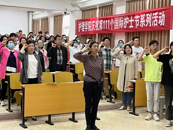 在护理学院实验室9102教室,学院党委书记、院长毕怀梅带领全体党员师生重温南丁格尔誓言。护理学院第一党支部书记郭趣老师以南丁格尔立志和创立护理学事业为主线,向全体师生上了一堂生动的护理精神思政课。师生们结合对南丁格尔精神的认识以身边的抗疫故事为背景分享了自己的学习感悟,畅谈了身为护理人的教育与自豪。