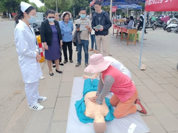 团委学生会组织学院护理技能大赛获奖同学到二食堂和四食堂的门口向前来就餐的师生现场展示徒手心肺复苏(CPR)技术操作要领,在同学们的认真讲解下,前来观看了解的师生们通过观看和上手实践基本掌握了这一操作的技术要领。此外,同学们还现场发放了《CPR急救步骤与注意事项》宣传册。
