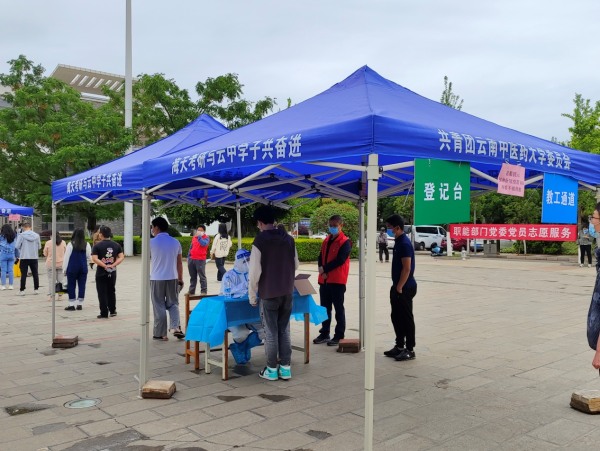 云中讯(职能部门党委)为落实属地部署的疫情防控工作,5月12-13日,学校组织开展全员核酸检测工作。为充分发挥基层党组织和党员在防疫一线的战斗堡垒和先锋模范作用,检测期间,职能部门党委共组织50余名党员全天候开展志愿服务活动,参与、协助核酸检测现场的流程讲解、信息采集、维持秩序等工作,助力学校有序完成本轮全员核酸检测。