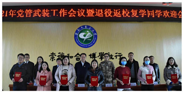 云中讯(通讯员 李冰玉)2021年12月3日,我校在呈贡校区召开2021年党管武装工作会议暨退役返校复学同学欢迎会。校党委书记、征兵工作领导小组组长王翠岗,党委副书记、征兵工作领导小组副组长荀传美,呈贡区人民武装部部长王莹,呈贡区退役军人事务局局长唐文荣、副局长张国平出席会议。