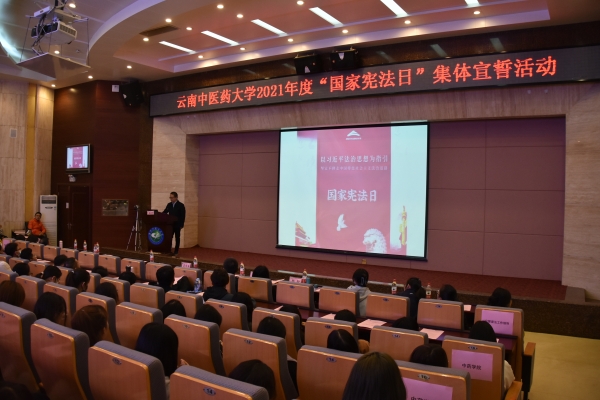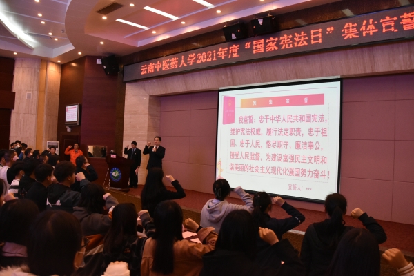 云中讯(记者 陈楠)12月3日下午,我校在呈贡校区翰墨楼举行“国家宪法日”师生集体宣誓仪式。校党委书记王翠岗出席仪式并讲话,各基层党组织负责法治宣教分管领导及专兼职工作人员、团学干部代表,基础医学院、中药学院、护理学院、人文与管理学院、信息学院、民族医药学院选派学生代表参加仪式。宣誓仪式由校党委副书记荀传美主持。