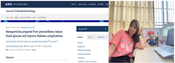 赵茜以第一作者在《Journal of Nanobiotechnology》发表研究论文“Nanoparticles prepared from pterostilbene reduce blood glucose and improve diabetes complications”(中科院工程技术二区,IF=10.435),该研究设计了一种以植物提取物(紫檀芪)作为缓释辅料的新型葡萄糖响应性智能系统。这种缓释辅料可以稳定降低血糖水平,降解后可发挥药理活性延缓糖尿病并发症。这种新型缓释辅料为植物提取物的发展建立一个新的研究点。