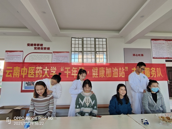 把“需求清单”转变为“服务菜单”,把为群众办实事落到实处。10月29日下午,由校社科联办公室、中医药宣讲办、党史学习教育领导小组办公室成员组成的志愿服务队,走进呈贡区斗南社区居委会,开展“千年健·健康加油站”志愿服务活动。服务队对村民宣讲了中医药养生常识并捐赠了中药香囊、秋梨膏、药皂、养生茶等养生物资,还对村民、村委会工作人员进行了50余人次的康养推拿按摩。同学们扎实的基本功、按揉点捏的专业手法获得了群众的一致赞许。