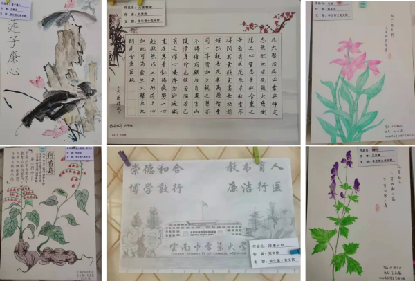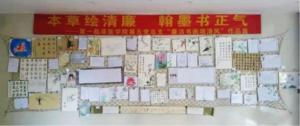第五党总支利用中医文化与清廉文化目标一致、原则趋同、理念互通等特点,融合中医学的“未病先防”“扶正祛邪”“大医精诚”等蕴含廉洁文化精髓的中医经典理论思想及“正气存内、邪不可干”等治病救人的诊疗理念,号召党员及团员把常用中药材、经典方剂、炮制方法与党风廉政建设进行充分融合,将寓意深刻的廉洁警句、生动盎然的本草元素、鲜活真实的经典药材,以书法、绘画的形式进行呈现,并在呈贡校区佩兰苑一楼大厅和白塔校区教学楼一楼大厅进行主题书画展,吸引了不少师生驻足参观。