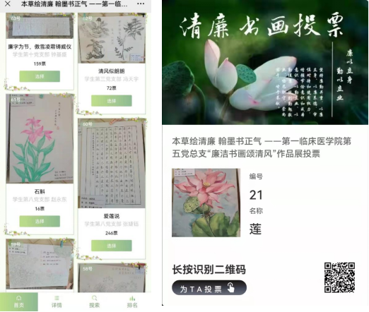 此外,第五党总支还通过在线投票的方式,将清廉书画作品电子版拍照上传,让更多师生为自己喜欢的作品投票,有效地扩大了活动的覆盖面和影响力,引导党员群众树立廉洁意识,筑牢思想道德防线。