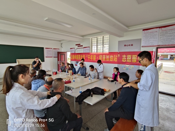 云中讯(新闻中心)10月29日下午,由校社科联办公室、中医药宣讲办、党史学习教育领导小组办公室成员组成的志愿服务队,走进呈贡区斗南社区居委会,开展“千年健·健康加油站”志愿服务活动,该活动也是云南省新时代文明实践社科普及与志愿服务项目,由学校志愿服务总队组织落实。在居委会工作人员召集下,科普教室一会儿就坐满了群众,服务队对村民宣讲了中医药养生常识并捐赠了中药香囊、秋梨膏、药皂、养生茶等养生物资,还对村民、村委会工作人员进行50余人次的康养推拿按摩。同学们扎实的基本功、按揉点捏的专业手法获得了群众的一致赞许。