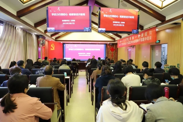 云中讯(附一院)2021年10月27日上午,第一附属医院深入学习贯彻党的十九届五中全会精神干部轮训暨2021年“万名党员进党校”集中培训开班仪式在5号楼401会议室举行,校党委书记王翠岗参加开班仪式,并为附一院党员、干部职工、学生共计200余人开班第一课“学史力行践初心,砥砺奋进开新局”。