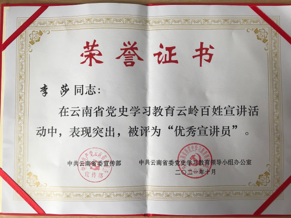 此次巡讲活动中,宣讲团成员进机关、进社区、进学校、进企业共开展了18场宣讲,行程两千余里,现场听众6000余人;网络直播11场、线上观众8万余人次。李莎老师在宣讲活动中表现突出,被授予“优秀宣讲员”荣誉称号。