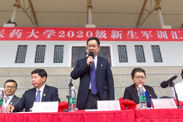 军训汇报表演开始,参训同学依次表演了擒拿拳、战地救援、八段锦以及花样队列。2020级本科生军训正值庆祝建党百年的重要历史节点,花样方阵的同学以队列表演的形式为中国共产党建党100周年献礼。他们在操场上变换队形,先后摆出“新时代”“新青年”“新征程”,校徽,校训“崇德和合、博学敦行”,“请党放心、强国有我”,党旗,庆祝建党100周年等巨型标语,以实际行动表达出青年一代对党的无限赤诚与热爱,展现了学校61年一路披荆斩棘,绘就的薪火相传的杏林画卷。