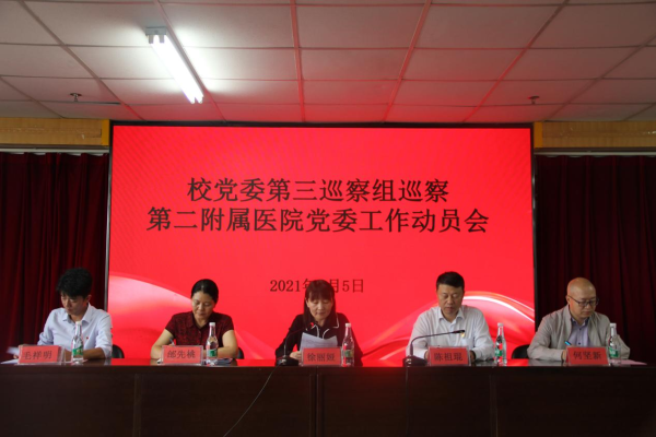 云中讯(第二附属医院)按照学校党委第四轮巡察工作统一部署,2021年7月5日校党委第三巡察组在第二附属医院召开巡察工作动员会,第三巡察组组长徐莉娅,副组长何坚新,巡察组成员孙智、袁启义、翟星,巡察督导指导组成员毛祥明,第二附属医院党政领导班子成员、中层干部、教职工代表、离退休职工代表、学生代表参加会议,会议由医院党委书记陈祖琨主持。