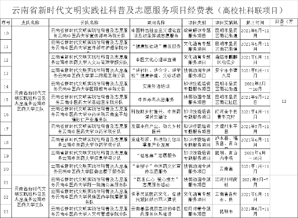 云中讯(记者 尧雪洲)近日,云南省社科联下拨了“2021年云南省新时代文明实践社科普及志愿服务项目”工作经费。此次,我校获该项目立项资助14项,立项和经费总数在云南省高校中均为最高。