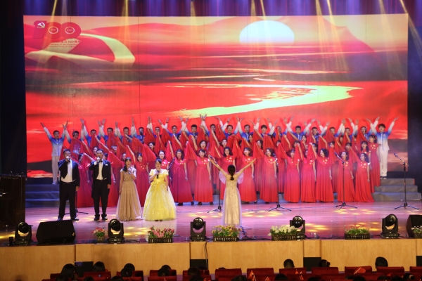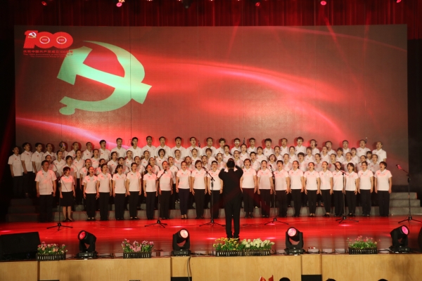晚会尾声,校领导移步上台与大家合唱《没有共产党就没有新中国》,将整台晚会推向高潮。师生们用歌声回望党风雨兼程砥砺前行的光辉历程,寄托对伟大祖国的美好祝愿。