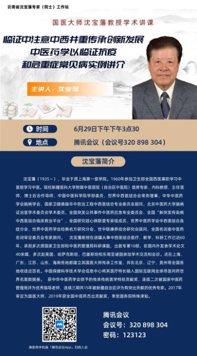云中讯(通讯员 叶勇)为提升中医药文化自信与学术自信,6月29日下午下午3点30,由云南省沈宝藩专家(院士)工作站(第一临床医学院)主办,国医大师沈宝藩将在线上进行专题讲座。题为:临证中注意中西并重传承创新发展中医药学——以临证抗疫和危重症常见病实例讲介。