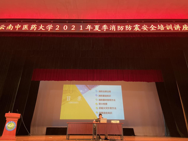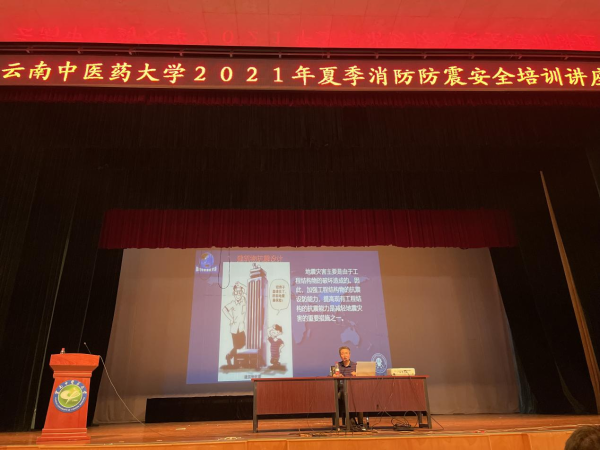 安全培训讲座中昆明市防震减灾局监测预报处处长陈静讲解地震安全知识及防范自救技能,包含地震基础知识和对人类的危害、地震时如何自救等方面,将专业的知识用图文并茂加生动形象的讲解方式传递给参训师生职工。