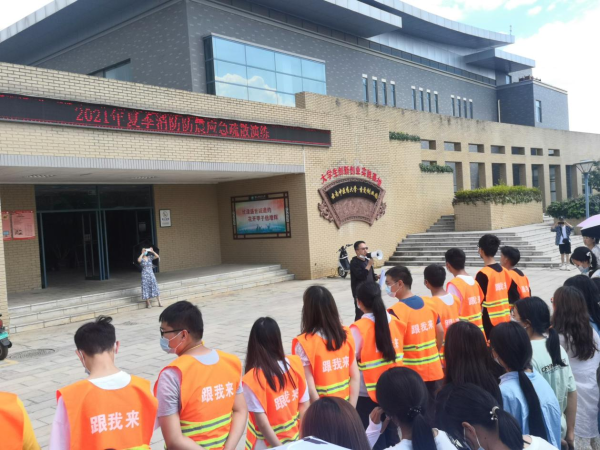 应急逃生疏散演练活动中保卫处黄老师向参训师生职工讲解要领,并控制演练节奏。警报声响起,根据引导员的指令,大家捂住口鼻,弯腰贴墙,有序、快速从安全出口逃离,远离烟雾,安全疏散至杏林广场。