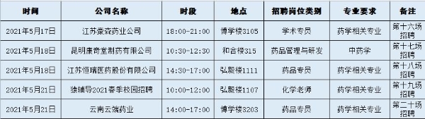 举办五场校园招聘会,不断拓宽就业渠道。中药学院主动联系校外企业到校开展校园招聘。江苏豪森药业公司、昆明康奇堂制药有限公司、苏恒瑞医药股份有限公司、北京猿力未来科技有限公司、云端药业五家企业先后进校开展校园招聘,提供招聘岗位上百个,拓宽了学生的就业渠道,为毕业生就业提供了更多的工作机会。