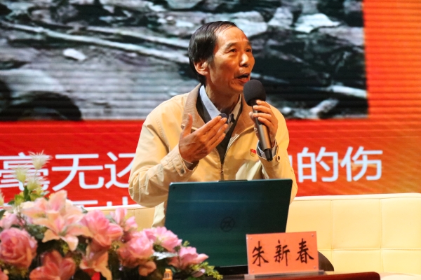 朱新春以入党、找党、跟党、永远听党的话、初心代代传五个方面为主题,回顾了父亲朱良才将军在革命最危机的关头,毅然走上革命道路;在西路军西征途中历经马匪追击、一路沿街乞讨,孤身一人历经艰难险阻寻找党组织;授上将军衔后成为新中国第一位主动让位的开国将军;退休后选择在家撰写文章,宣传革命传统,撰写了《朱德的扁担》等文章;一生践行“永远跟党走”的初心使命,以“淡泊名利,执著人生”的优良家风教育后人。通过一个个生动的故事,师生们更深切地感知到在应对各种困难挑战中,中国共产党锤炼出的不畏强敌、不惧风险、敢于斗争、勇于胜利的风骨和品质。