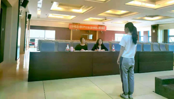 本次综合面试由学校志愿者工作站(校团委)协同COP15 云南省筹备办志愿者工作部开展,邀请到云南省志愿者协会、云南新东方国际教育培训中心、悦无垠志愿讲师团队等机构获得国家一级心理咨询师、国家一级人力资源管理师和TKT教师认证的专家以及长期组织实施志愿服务活动的专业人员作为评委,对志愿者候选人进行了语言能力、心理素质、专业技能和综合素质四个方面的评估。