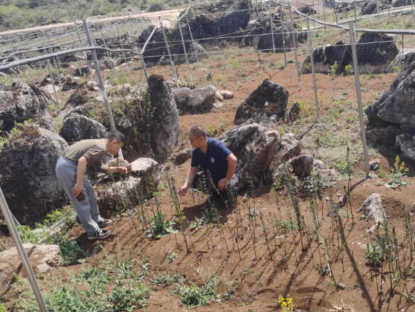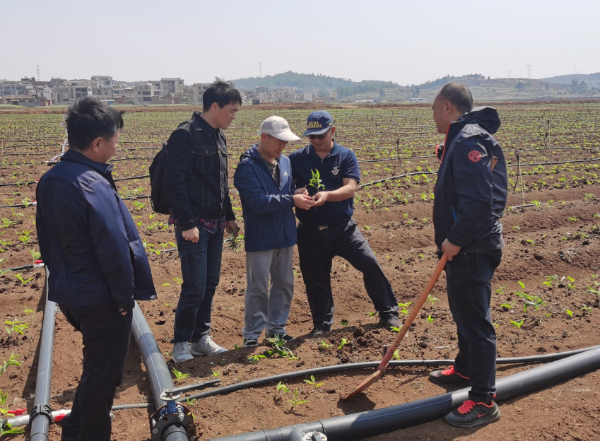 2021年4月2日,在泸西县发改局主任孟鹤翔的陪同下,中药学院专家听取中草药种植基地负责人周建波介绍了黄精和半夏连片种植情况,并进行了实地查看。季鹏章就目前基地中存在的种植问题,开展现场指导,并提出相应技术措施。张磊建议适当遮阴并在雨季来临前提前预防根茎腐病的爆发;张文平实地采样后,立即联系中药学院药用植物学专家对基地的滇黄精和半夏开展种源鉴定。泸西县发改局、农业农村局和相关企业对专家服务团的工作充分肯定,双方又详细讨论了今后的合作计划。