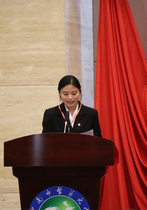 校学生会执行主席曹淇代表校学生会发言,她提出4点建议与大家共勉:一是必须始终把稳,理想信念之舵不动摇,坚定听党话、跟党走;二是必须始终严守,改革纪律之戒不含糊,永葆政治性、先进性、群众性;三是必须始终保持,服务同学之本不偏离,践行从同学中来,到同学中去;四是必须始终夯实,组织建设之基,坚实推进全面从严治会。