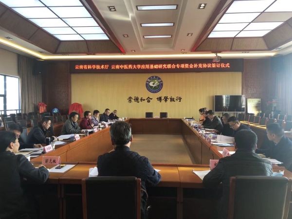 云中讯(记者 程三娟 通讯员 吕小满)2月2日上午,《云南省科学技术厅-云南中医药大学应用基础研究联合专项资金补充协议(2020-2025)》签约仪式暨2021年理事会会议在我校呈贡校区举行。省科技厅副厅长赵海波,省卫健委副主任、省中医药管理局局长姜旭,校长熊磊及全体理事出席会议。副校长孟庆红主持会议。