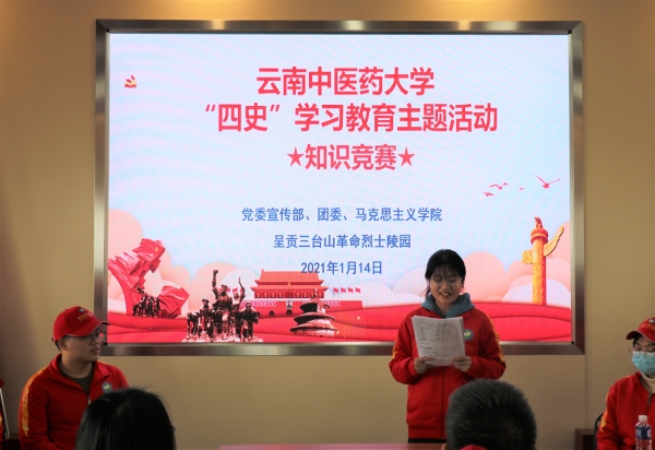 云中讯(记者 程三娟)1月14日下午,云南中医药大学党委宣传部、团委和马克思主义学院共80余名党员师生前往呈贡三台山党建文化公园,开展“四史”学习教育主题活动,从中国共产党的百年传奇中感悟红色基因,汲取精神力量。校党委副书记荀传美参加活动。