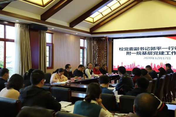 云中讯(第一临床医学院)2020年12月17日下午,校党委副书记郭平一行到第一附属医院调研指导基层党建工作。调研指导主要采取听取汇报、座谈交流等方式进行,2020年党支部规范化建设达标考核校级复查工作同时进行。党支部规范化建设达标考核校级复查组成员,医院党政领导、党总支书记、副书记;22个2020年规范化建设达标创建党支部书记;其他无临床、教学任务党支部书记共计80余人参加了会议,会议由医院党委书记陈燕溪同志主持。